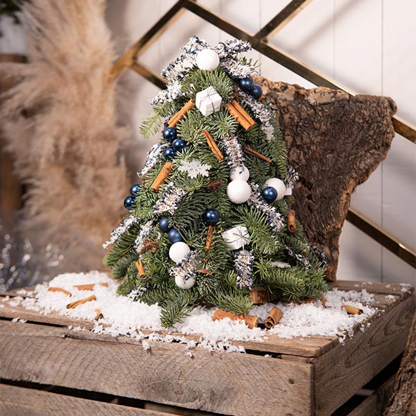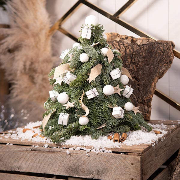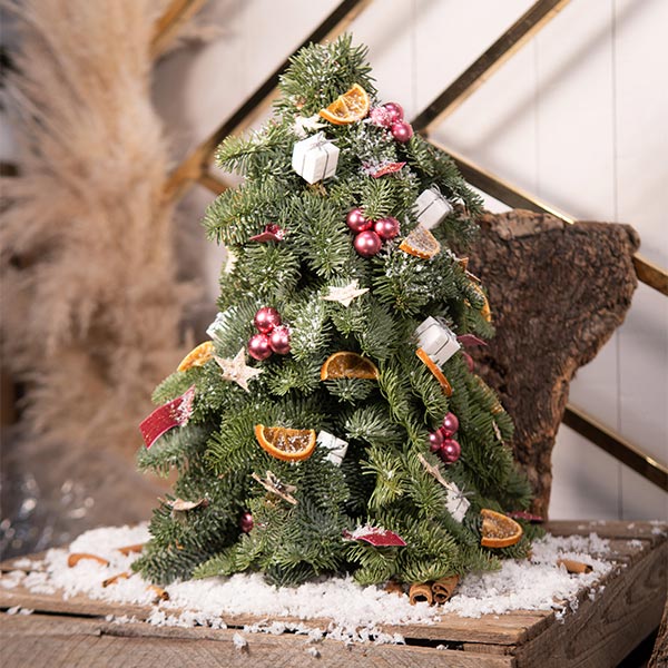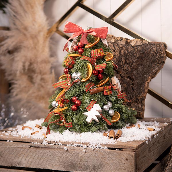 Mini sapin de Noël naturel reconstitué – élément de décoration ou sapin idéal dans les petits espaces afin de fêter Noël. Apportez une touche de magie supplémentaire en entourant autour de ce mini sapin, une guirlande LED afin d’éclairer votre décoration de Noël !